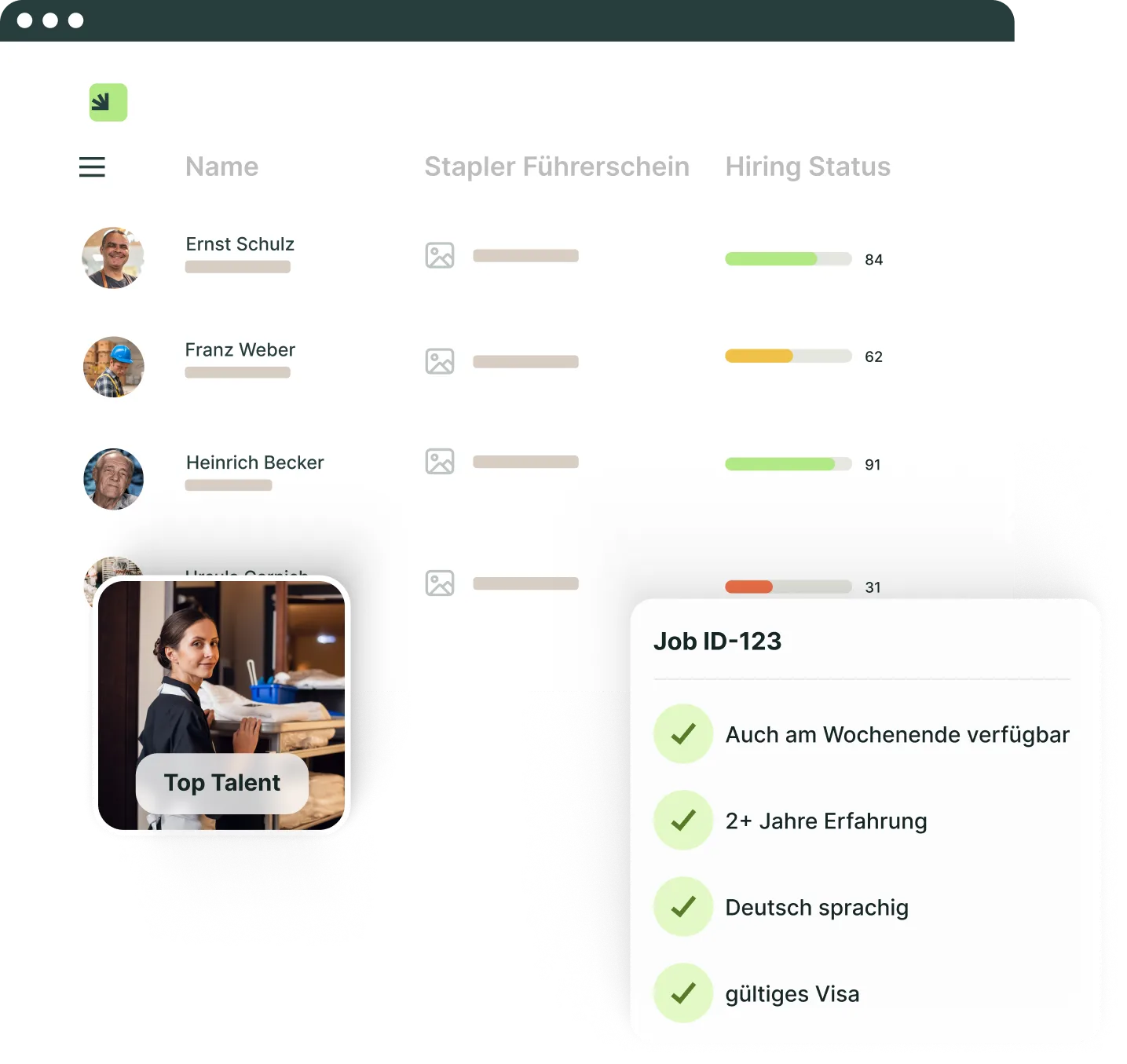 Unsere Plattform bewältigt problemlos hohe Bewerberzahlen und unterstützt Sie nahtlos bei Selektion, Vertragserstellung, Signatur und Dokumentenmanagement. Ideal für Unternehmen mit großem Personalbedarf oder hoher Fluktuation.