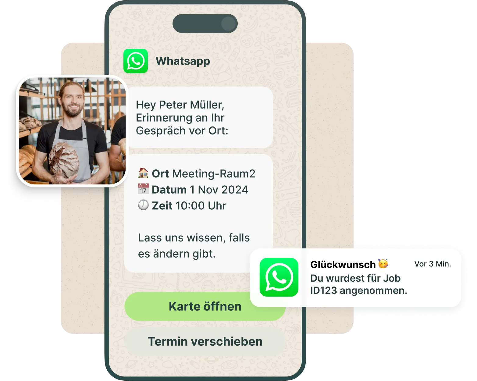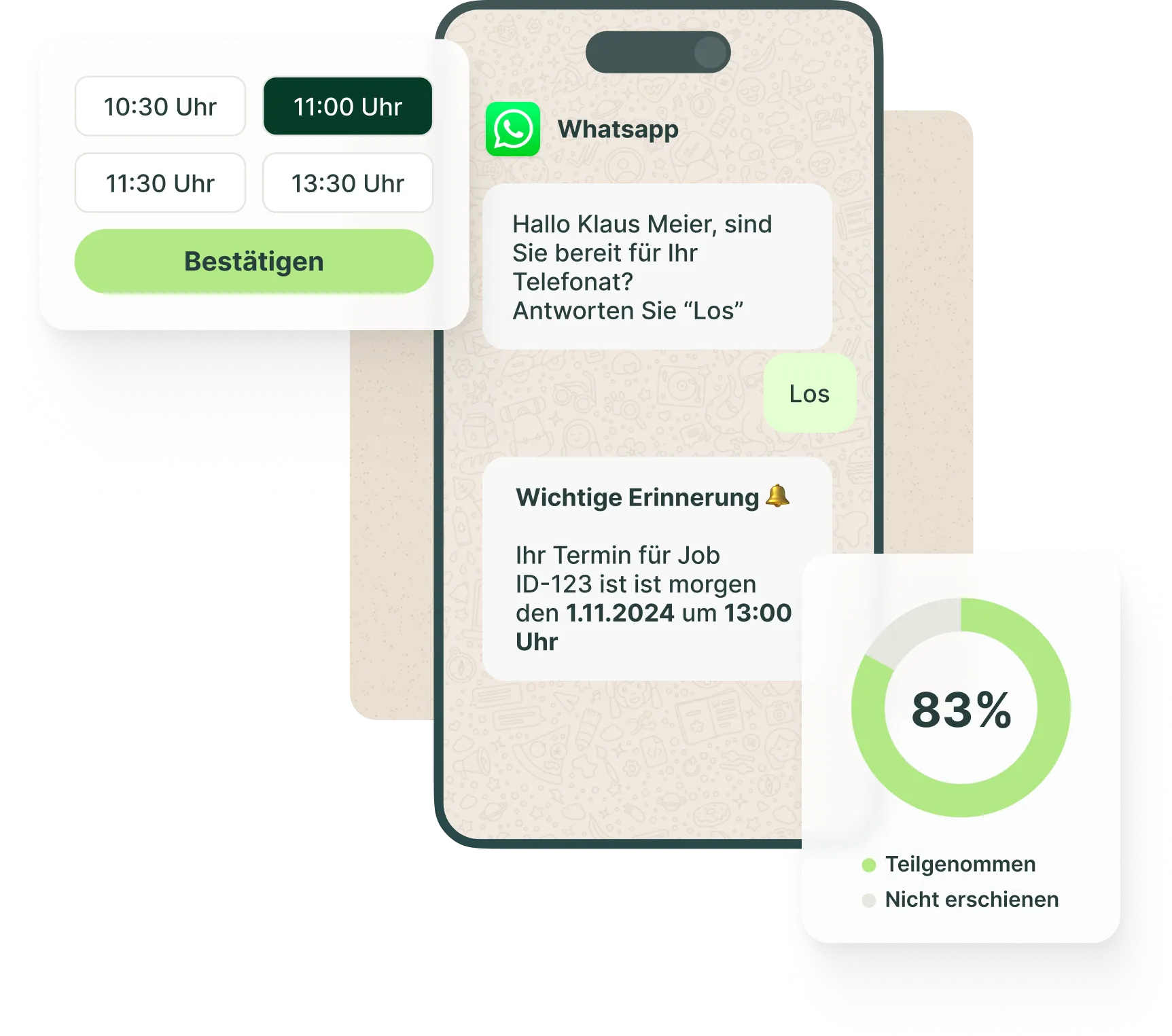 Reduzieren Sie Interview-No-Shows mit einer flexiblen Terminplanung und automatischen Erinnerungen über Whatsapp, Email oder SMS. Stellen Sie sicher, dass deutlich mehr Bewerbende ihre Interviews oder Termine zur Hospitation wahrnehmen.